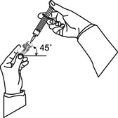 11. Быстро вставить иглу через резиновую пробку во флакон. Затем срез иглы опустить вниз и, наклонив флакон под углом 45°, медленно набрать в шприц суспензию полностью (рис. 9).