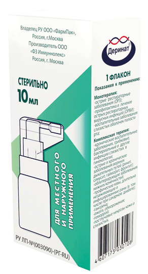 | Деринат®, раствор для местного и наружного применения, 0.25%, флакон (флакончик) стеклянный 10 мл - пакет (пакетик) картонный с насадкой-распылителем, Производитель: ФЗ Иммунолекс (Россия), | ||