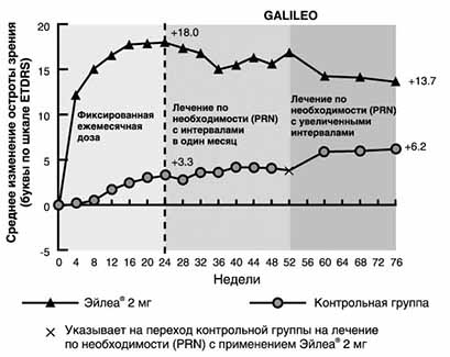3 В исследовании GALILEO с 52-й по 68-ю нед и контрольная группа, и группа препарата Эйлеа® 2 мг получали препарат Эйлеа® 2 мг по необходимости (PRN) каждые 8 нед, пациенты приходили на прием в обязательном порядке каждые 8 нед.