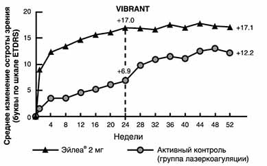 В исследовании VIBRANT первичной конечной точкой эффективности являлась доля пациентов, у которых МКОЗ увеличилась по крайней мере на 15 букв через 24 нед по сравнению с исходным состоянием, этот показатель в группе препарата Эйлеа® превосходил показатель в группе активного контроля.