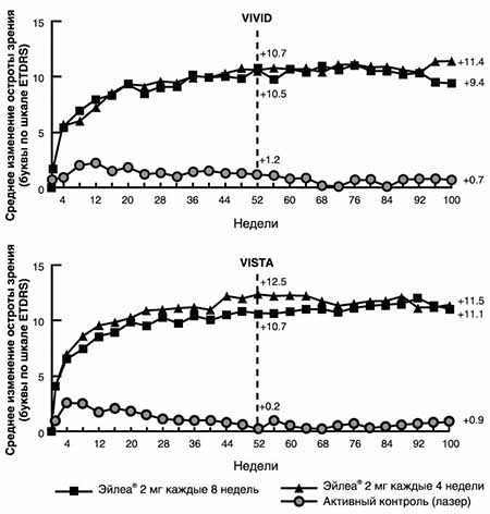Начиная с 24-й нед 67 пациентов группы активного контроля получали «терапию спасения» препаратом Эйлеа® (группа активный контроль/препарат Эйлеа® 2 мг), что привело к улучшению остроты зрения в среднем на 5 букв с 24-й по 52-ю нед.