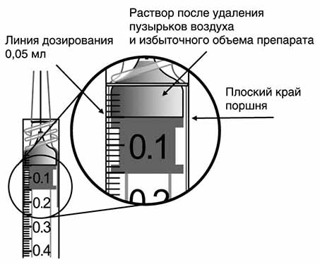 9. Медленно надавливая на поршень так, чтобы его край достиг метки 0,05 мл на шприце, удаляют все пузырьки и избыточный объем препарата.