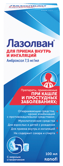 | Лазолван®, раствор для приема внутрь, 15 мг/5 мл, флакон темного стекла 100 мл - пачка картонная с мерным стаканом (стаканчиком), Производитель: Санофи С.Р.Л. (Италия), | ||