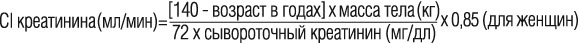 Нарушение функции почек. У пациентов с нарушенной функцией почек дозу подбирают индивидуально, с учетом клиренса креатинина (табл.), который рассчитывают по следующей формуле: