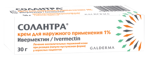 Механизм действия препарата Солантра® при лечении воспалительных поражений кожи при розацеа неизвестен, но может быть связан как с противовоспалительными эффектами ивермектина, так и со способностью ивермектина вызывать гибель клещей Demodex, которые, в свою очередь, являются фактором, вызывающим воспаление кожи.