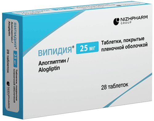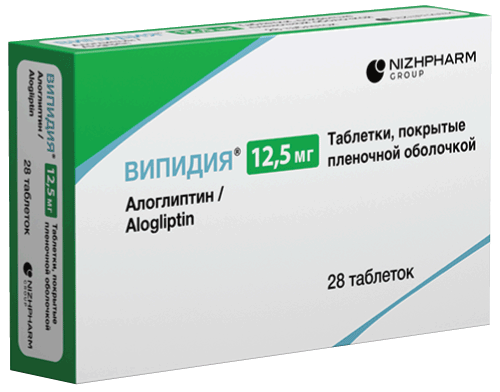 Пациенты с нарушением функции почек. Пациентам с легкой почечной недостаточностью (Cl креатинина от >50 до ≤80 мл/мин) коррекции дозы препарата Випидия® не требуется. У пациентов с почечной недостаточностью средней степени тяжести (Cl креатинина от ≥30 до ≤50 мл/мин) доза препарата Випидия® составляет 12,5 мг один раз в сутки. Алоглиптин не должен применяться у пациентов с тяжелой почечной недостаточностью и пациентов с терминальной стадией почечной недостаточности, нуждающихся в гемодиализе (Cl креатинина от <30 мл/мин). Алоглиптин не изучался у пациентов, проходящих перитонеальный диализ. Пациентам с почечной недостаточностью рекомендуется проводить оценку функции почек до начала лечения препаратом Випидия® и периодически в процессе лечения.