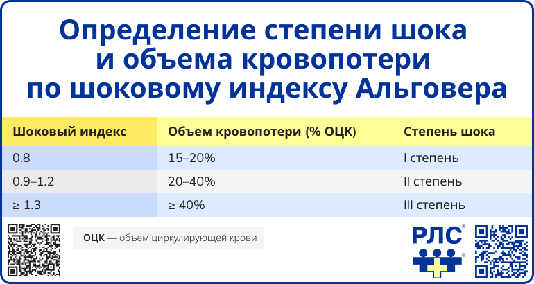 | Шоковый индекс | Объем кровопотери (% ОЦК) | Степень шока |