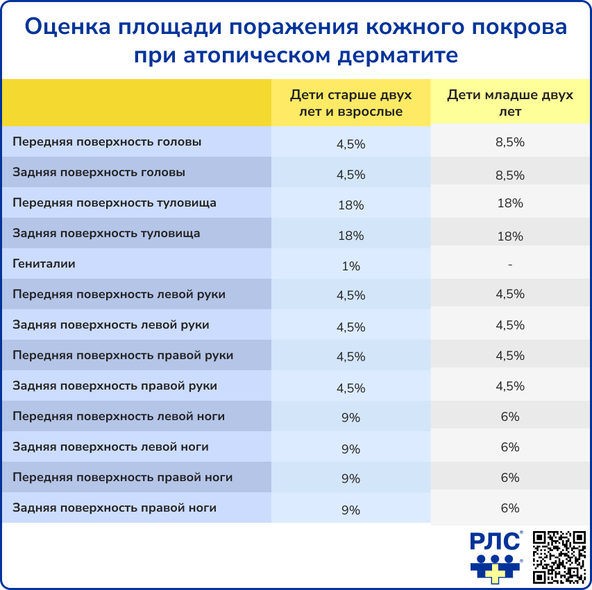 Площадь поражения кожи рассчитывается с использованием правила «девяток», широко применяемого для оценки ожоговых поражений: каждая анатомическая область тела составляет определенный процент от общей поверхности кожи. Для определения площади поражения за единицу измерения принимается площадь ладони пациента, равная примерно 1% от поверхности тела. У детей младше двух лет применяется отдельная шкала значений, что учитывает особенности возрастной анатомии.