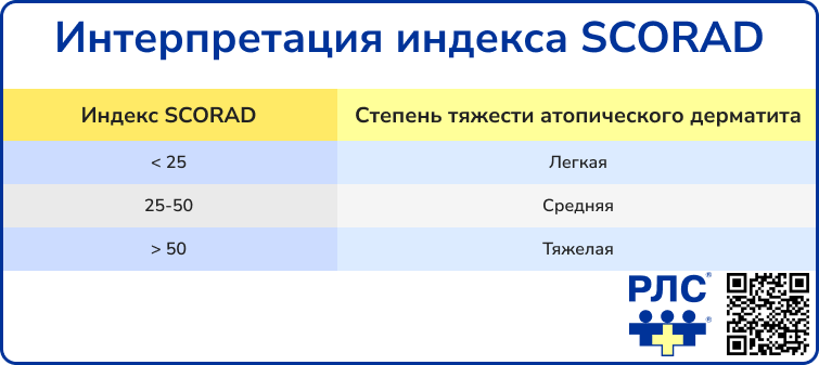 Итоговый индекс SCORAD рассчитывается с использованием формулы, включающей площадь поражения, среднее значение интенсивности объективных признаков и субъективные ощущения пациента, что позволяет классифицировать тяжесть атопического дерматита как легкую, умеренную или тяжелую.