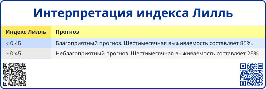 | < 0.45 | Благоприятный прогноз. Шестимесячная выживаемость составляет 85%. |