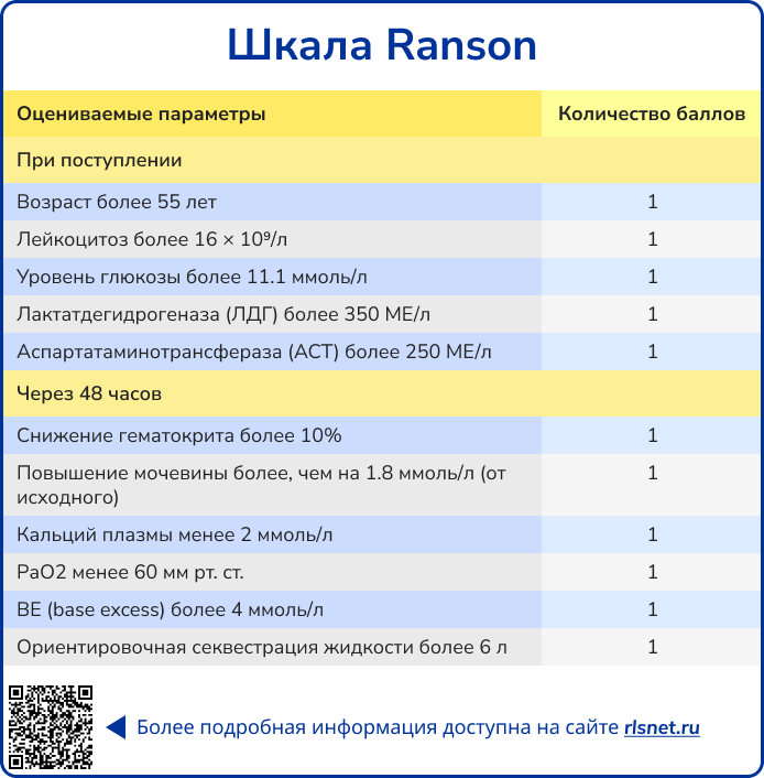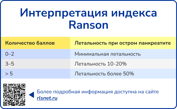 Шкала Ranson, разработанная J.H.C. Ranson в 1974 году, представляет собой прогностический инструмент, включающий 11 клинических и лабораторных критериев, позволяющих оценить тяжесть острого панкреатита и прогнозировать его исход. Пять параметров оцениваются при поступлении пациента, остальные шесть — через 48 часов, что обеспечивает динамическое наблюдение за прогрессированием заболевания, но ограничивает возможность раннего интенсивного вмешательства в так называемые «золотые часы» максимальной эффективности терапии. Несмотря на это, шкала широко применяется в клинической практике благодаря высокой диагностической ценности: чувствительность шкалы варьирует в пределах 57–85%, специфичность — 68–85%, а отрицательная прогностическая ценность при выявлении тяжелого острого панкреатита достигает 92–95%.