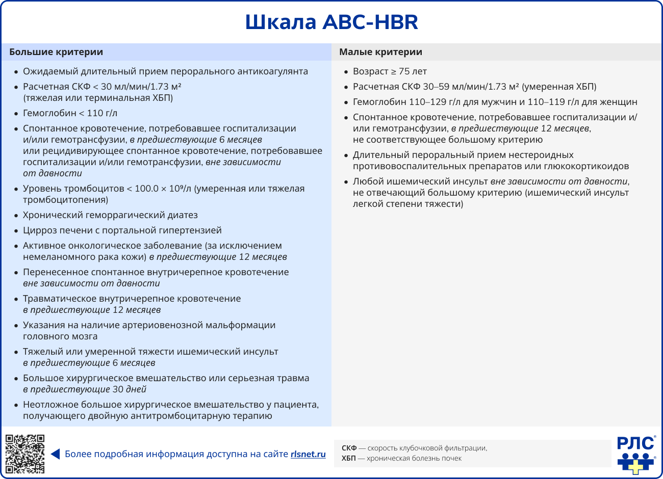 Шкала ABC-HBR включает критерии, подразделяющиеся на большие и малые, которые используются для определения высокого риска кровотечений.