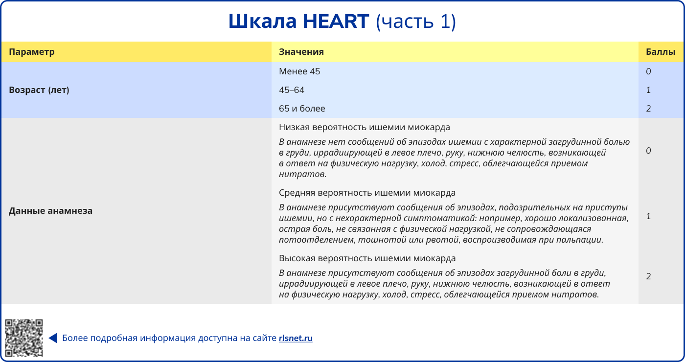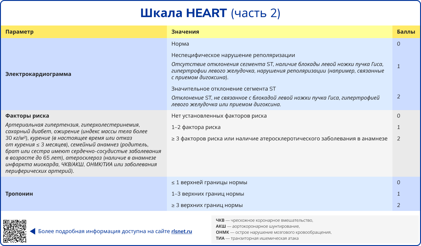 Шкала HEART (History, ECG, Age, Risk factors, Troponin) — это инструмент, используемый в медицине для оценки риска основных неблагоприятных сердечных событий у пациентов, поступающих с болью в груди в отделение неотложной помощи. Он помогает врачам определить, находится ли пациент в группе низкого, умеренного или высокого риска краткосрочных неблагоприятных исходов, таких как инфаркт миокарда. Шкала применяется у пациентов в возрасте 21 года и старше при наличии клинических симптомов, предполагающих острый коронарный синдром.