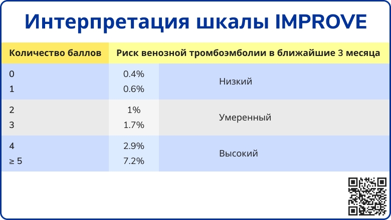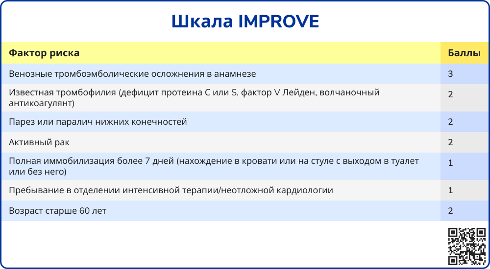 Шкала IMPROVE (International Medical Prevention Registry on Venous Thromboembolism) является валидированным инструментом для оценки риска тромбоэмболии глубоких вен (ТГВ) и тромбоэмболии легочной артерии (ТЭЛА) у госпитализированных нехирургических пациентов. Она была разработана на основе данных международного регистра и широко используется для стратификации риска венозной тромбоэмболии (ВТЭ) в условиях стационара, позволяя выделить пациентов, нуждающихся в тромбопрофилактике.
