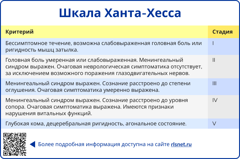 Каждое клиническое описание соответствует определенной стадии (степени тяжести) субарахноидального кровоизлияния, отражающей уровень нарушения сознания, выраженность очаговой и общемозговой неврологической симптоматики, а также наличие менингеальных проявлений. Повышение степени по шкале ассоциируется с увеличением риска осложнений, неблагоприятного функционального исхода и летальности.