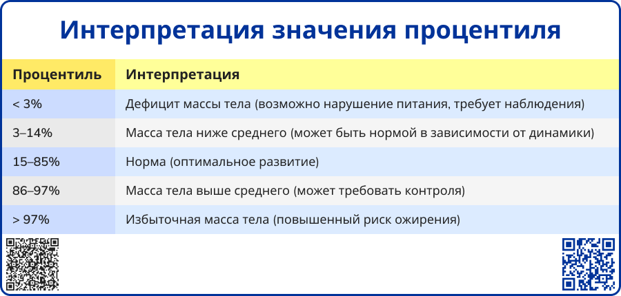 - значения ниже 3-го или выше 97-го процентиля указывают на риск дефицита либо избытка массы тела и требуют углубленного наблюдения и оценки питания.