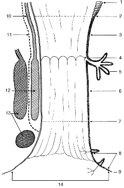 1 — эпителий ректального типа; 2 — аноректальная гистологическая граница, верхняя граница хирургического анального канала; 3 — эпителий анальной переходной зоны; 4 — зубчатая линия; 5 — анальные железы; 6 — плоскоклеточный эпителий; 7 — слизисто-кожная гистологическая граница (linea mucocutanea), нижняя граница анального канала; 8 — плоскоклеточный эпителий перианальной области с кожными придатками (околоанальные железы Гея и др.); 9 — истинная кожа (граница с перианальной областью); 10 — внутренний циркулярный мышечный слой; 11 — волокна продольного мышечного слоя; 12 — m. sphincter ani internus; 13 — m. sphincter ani externus; 14 — перианальная зона; 4–7 — анатомический анальный канал; 2–4 — анальная переходная зона; 2–7 — хирургический анальный канал, выше 2 — прямая кишка