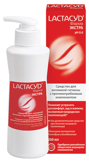 Средство для интимной гигиены при молочнице с противогрибковым компонентом. В качестве средства для интимной гигиены в период лечения молочницы для облегчения зуда и раздражения, pH 8.0.
