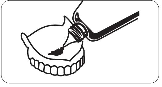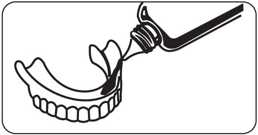Посыпать фиксирующий порошок тонким слоем на влажный зубной протез (см. рисунок).